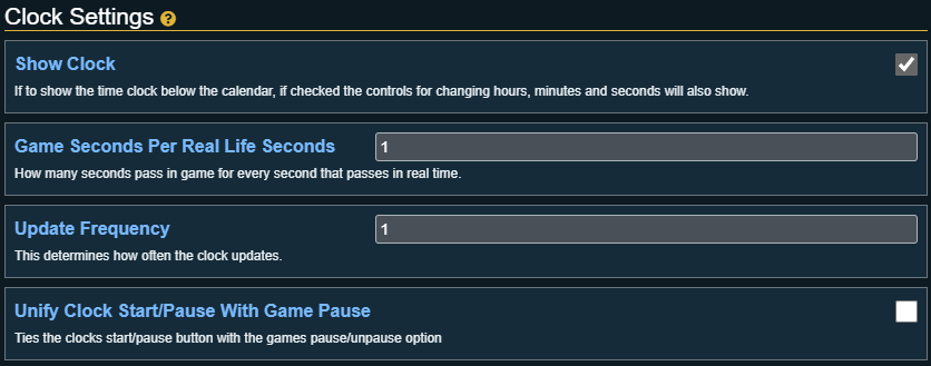 This setting is used to show the time clock below the calendar or to hide it. Not all games care about keeping track of the specific time of day so this is a great option to disable that part. Hiding the clock also hides the controls for changing hours, minutes, seconds.