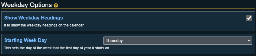 This is used to select the day of the week that the first day of year zero starts on. This can be used to help adjust the calendar so the days line up with official calendars.