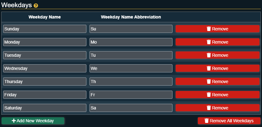 Set the abbreviated name for the weekday. This defaults to the first 2 letters of the weekdays name. This will show if configured in any of the Date/Time Formatting settings.