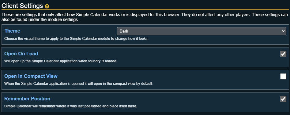 These are settings that affects how Simple Calendar works or is displayed for players using this browser. They do not affect any other players. These settings can also be found under FoundryVTT's module settings.