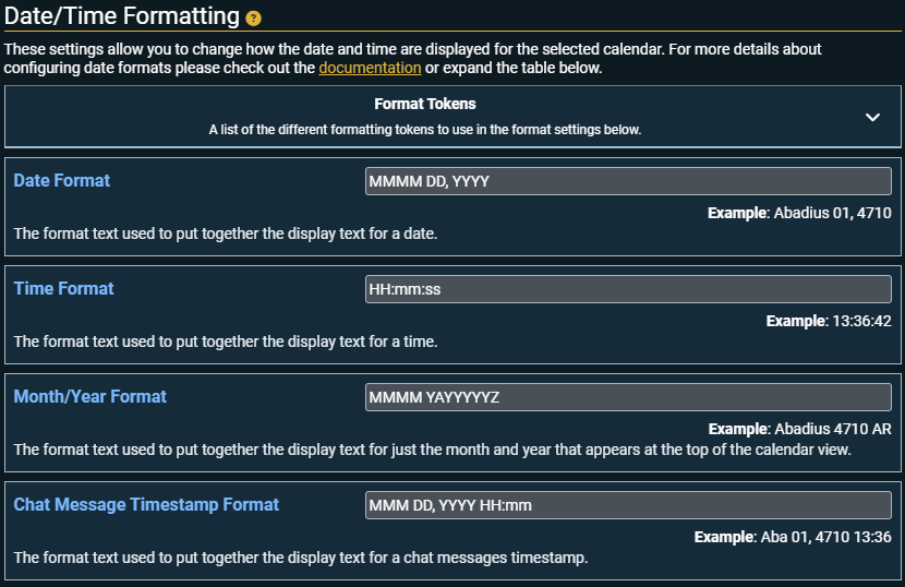 | Date Format | This format text is used when displaying a date anywhere in Simple Calendar. | MMMM DD, YYYY |