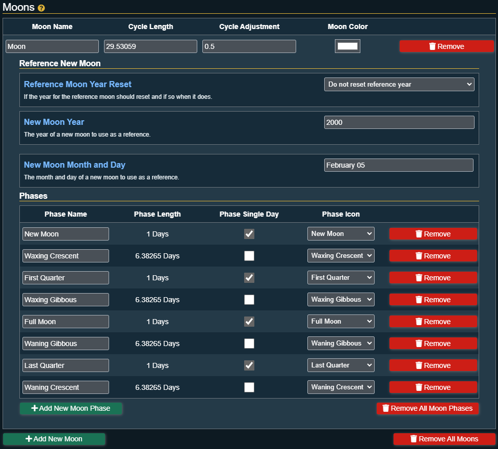 Next to each moon phase is a remove button that will remove that specific moon phase from the list. Under the list of moons there is a button called "Remove All Moons Phases" that will remove every moon phase from the list.