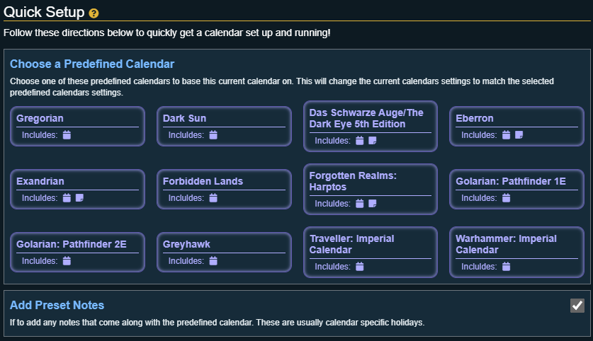 The first step is to choose from a list of predefined calendars that will be used as the basis to get your calendar started with. All of these calendars can be further customized after they are loaded. They are here to provide a simple starting point for your game.