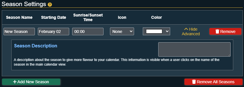 A description of the season that users can view when clicking on the season name in the calendar. The description does support the addition of HTML to format the text.