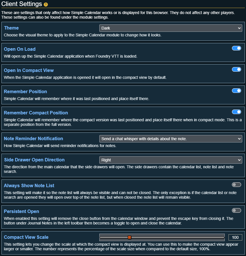 These are settings that affects how Simple Calendar works or is displayed for players using this browser. They do not affect any other players. These settings can also be found under FoundryVTT's module settings.