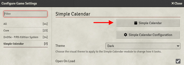 Simple Calendar can also be opened through the Configure Settings dialog of Foundry.